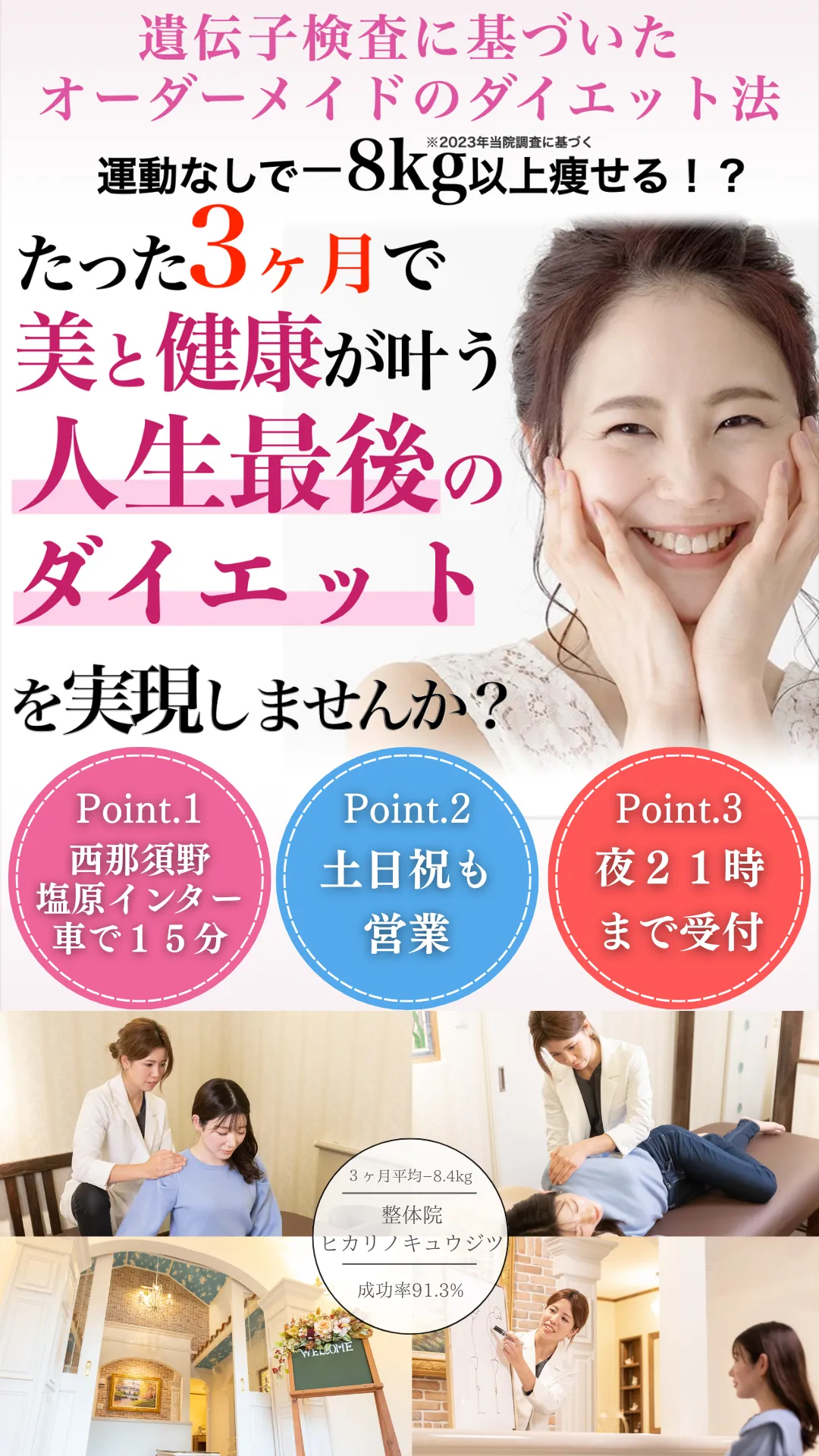 ダイエットのプロとしての証である資格を保有し、数多くのお客様から支持され、あなたの悩みに真正面から向き合う、整体院に来院し、健康と美容の先にある理想の自分を叶えて心から思いっきり楽しめる人生を手に入れる道。